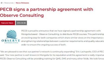 Бид Канадад төвтэй байгууллагын болон хувь хүний баталгаажуулалтын PECB байгууллагатай 2013 оноос хамтран ажиллаж байна. Бид уг байгууллагын Монгол хамгийн анхны бөгөөд хамгийн өргөн хэлбэрийн түншлэгч байгууллага юм.</p>